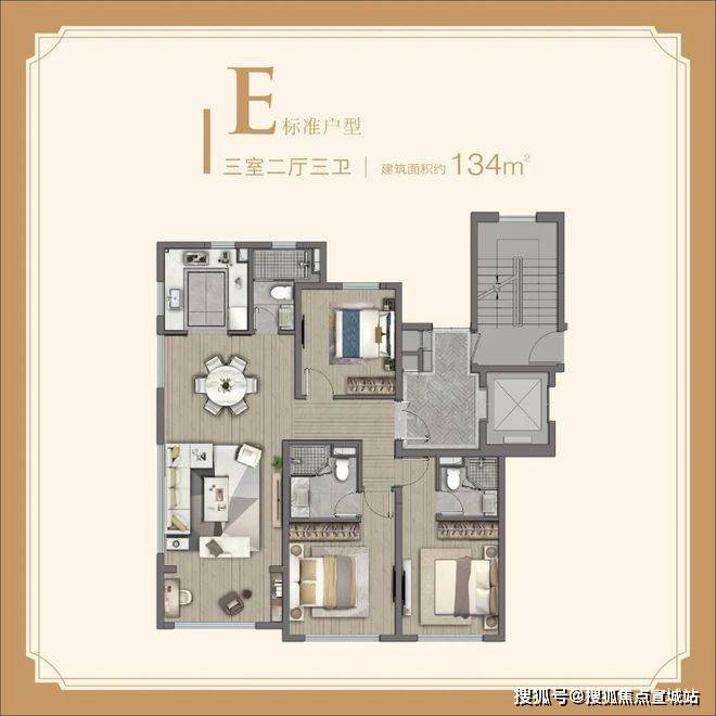 所以,该户型即使中间套都是真南北通透,三个房间分列客餐厅两侧,互不打扰;类一梯一户也是标配。
