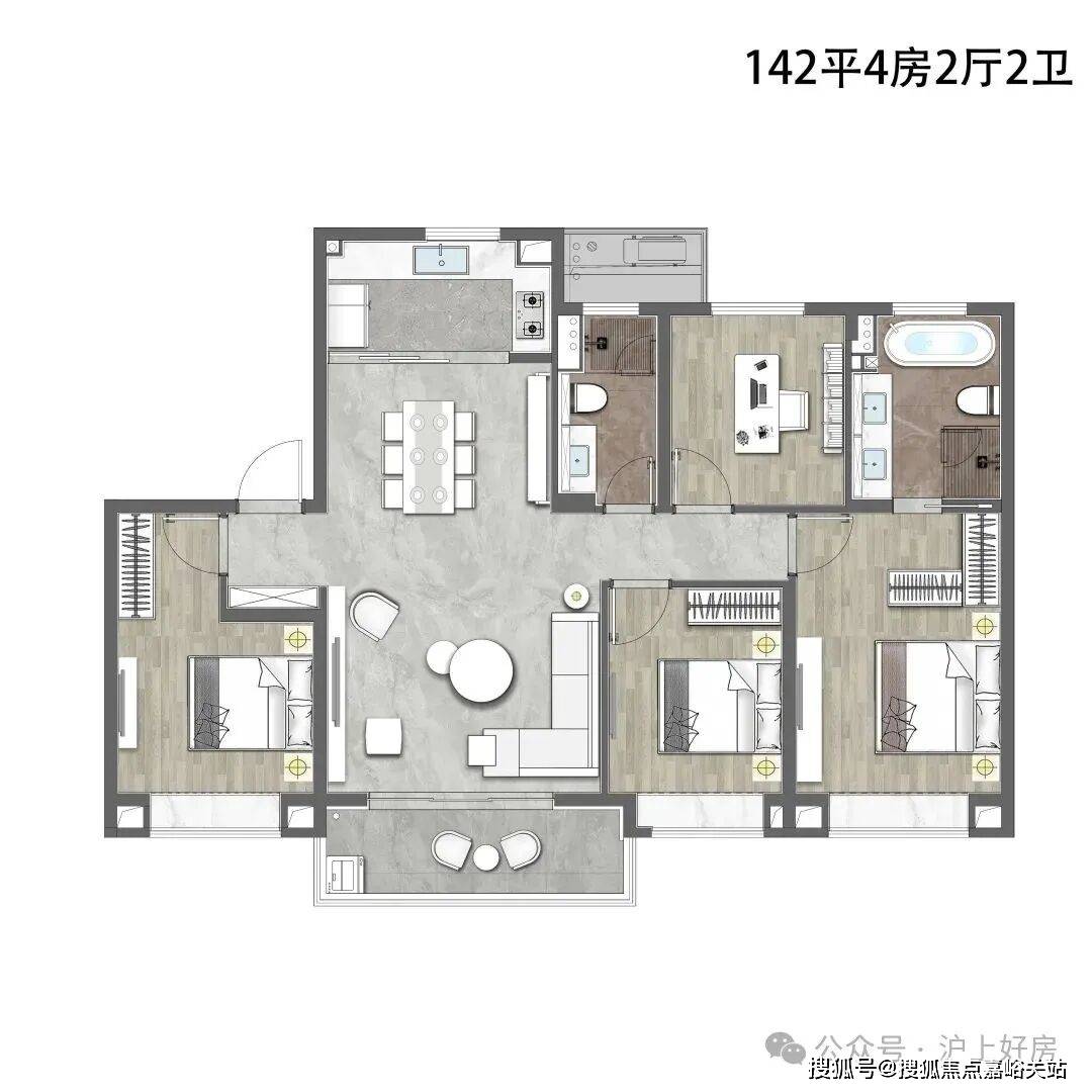 该户型做到了四开间朝南+南北通透+主卧套房设计+南卧带飘窗,一步到位的大4房。