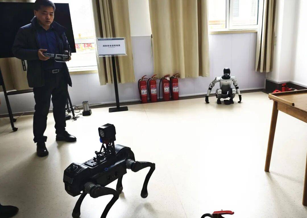 在另外一间训练室内,训练师正在训练机器人整理床铺、衣物叠放、推轮椅等动作;训练机器狗进行物品递送、消防安全巡检等功能。