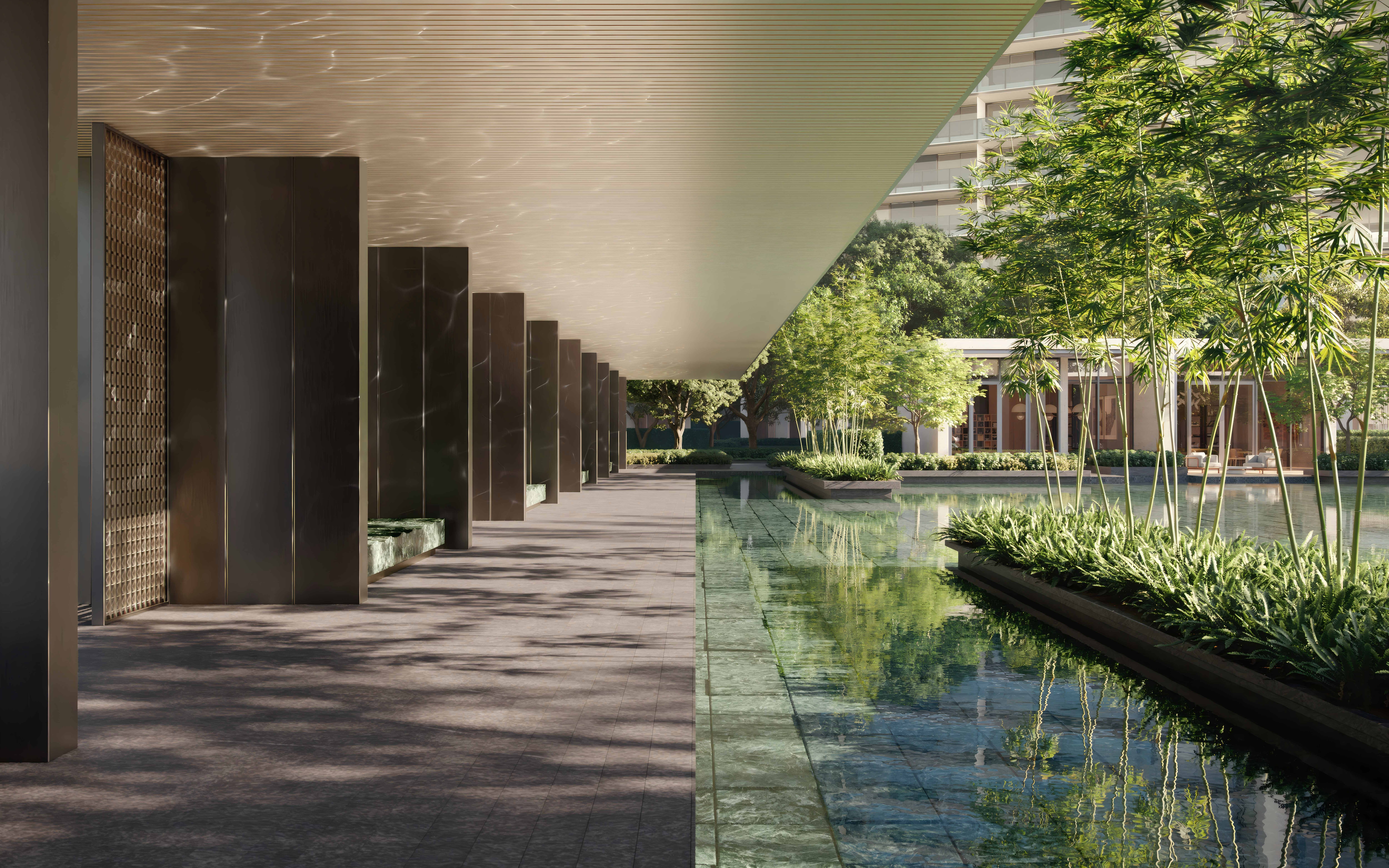 全球华人设计教父梁志天以水为主题的会所群落,以1500㎡中心水景贯穿庭院,蜿蜒串起三幢会所建筑,打造出繁华都市中极为稀缺的心灵栖息地与隐世桃源,满足业主餐饮社交、阅读时光、运动健康、疗愈放松、艺趣娱乐等多场景需求。