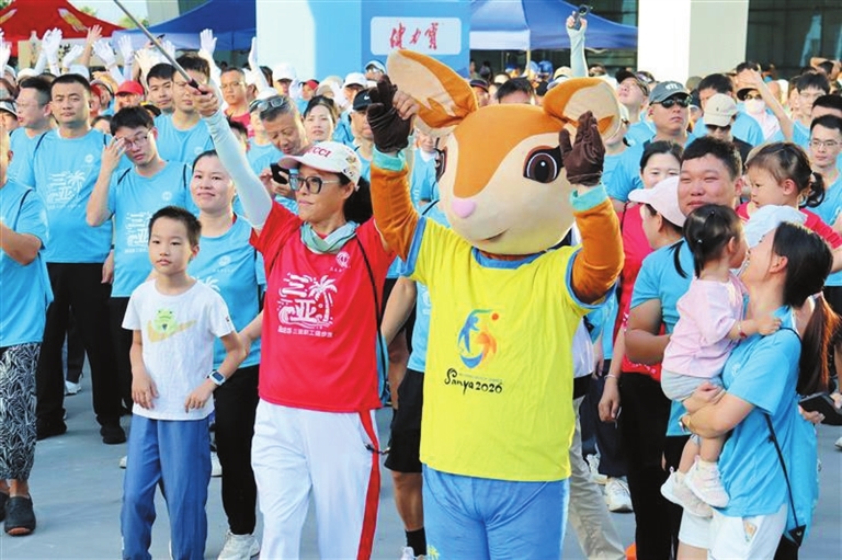 2025三亚职工健步走活动现场,三亚亚沙会吉祥物“亚亚”与市民游客互动。王昊 摄