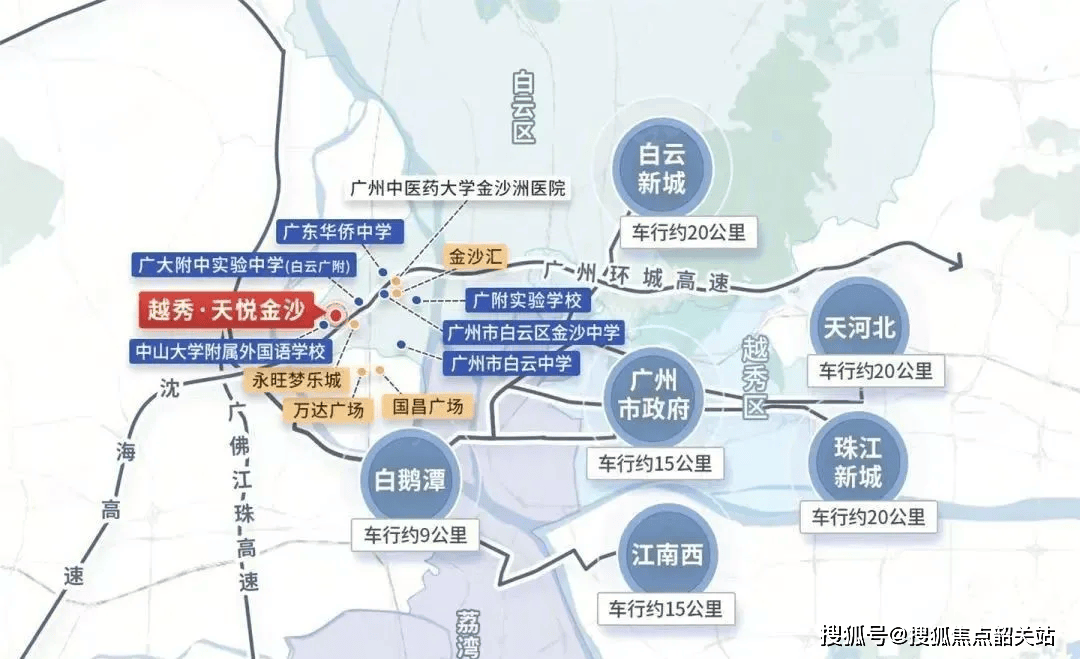 越秀·天悦金沙坐落于金沙洲核心区域,地理位置优越,横跨广州白云区和佛山南海区,临近荔湾,与广州主城区(广钢新城、白鹅潭、白云新城等)距离较近,符合多数置业人群的通勤距离需求,尤其适合工作圈在广州西部的购房者。