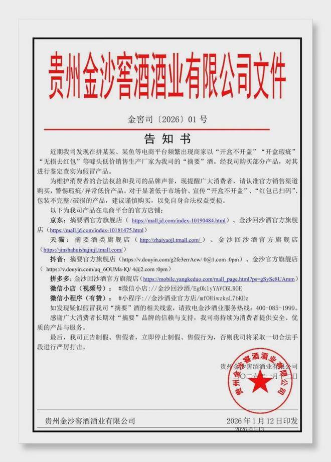 面对困局,金沙酒业没有停滞,而是以主动作为破局,在打假护牌、品质升级、渠道深耕与绿色发展上持续发力,展现出穿越周期的决心与行动力。此次针对假冒摘要酒的打假行动,明确公示官方渠道,提醒消费者警惕低价瑕疵产品,不仅是对假冒乱象的强力整治,更以明确态度维护市场秩序,为品牌健康发展扫清障碍,也让消费者重拾对品牌的信任。
