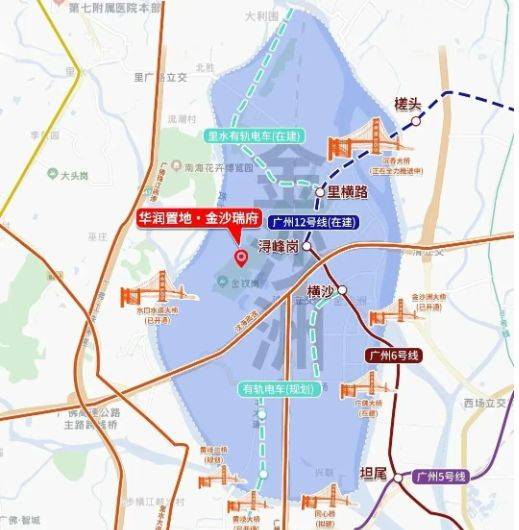 金沙瑞府位于白云区金沙洲板块,可通过轨道交通与城市道路系统实现广佛区域的通勤联通。轨道交通方面,项目与地铁6号线号线浔峰岗站存在直线距离连接,可实现与荔湾、越秀、天河等中心城区的轨道换乘通达。道路方面,金沙洲区域拥有大坦沙大桥、水道口大桥、黄岐大桥、金沙洲大桥等多座跨江交通设施,形成内联白云与荔湾、外接佛山中心区域的通勤方式。此外,沉香大桥、同心桥等工程仍在建设中,碧江大桥亦处规划阶段,未来将进一步改善片区道路穿透能力。