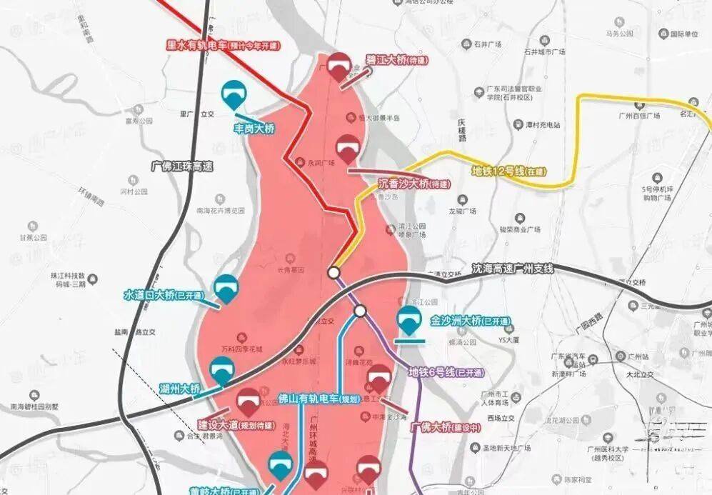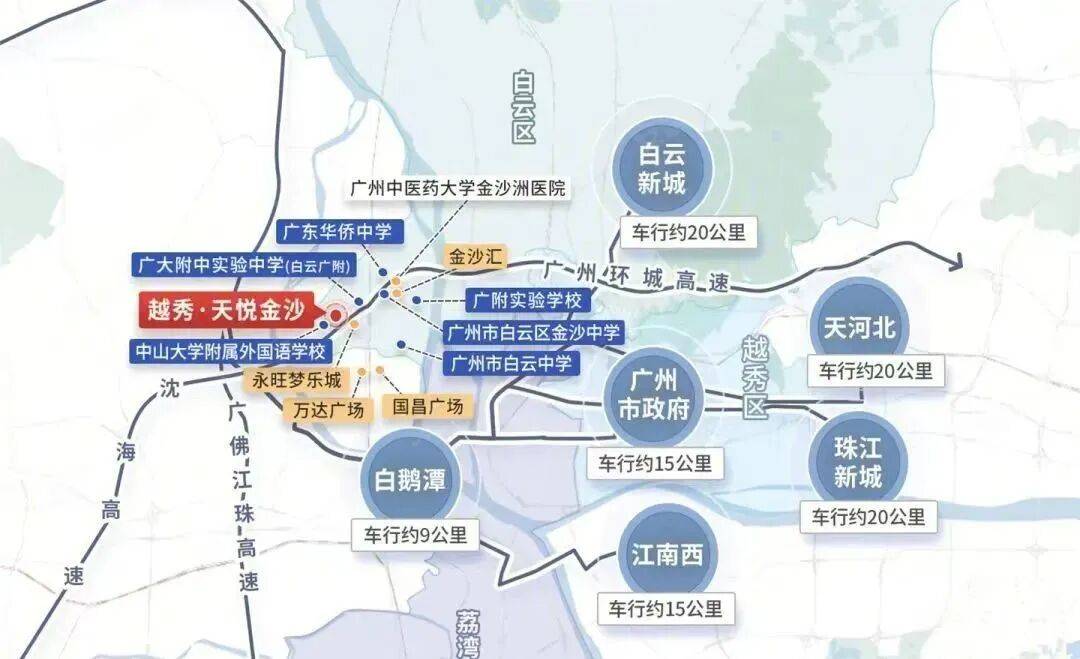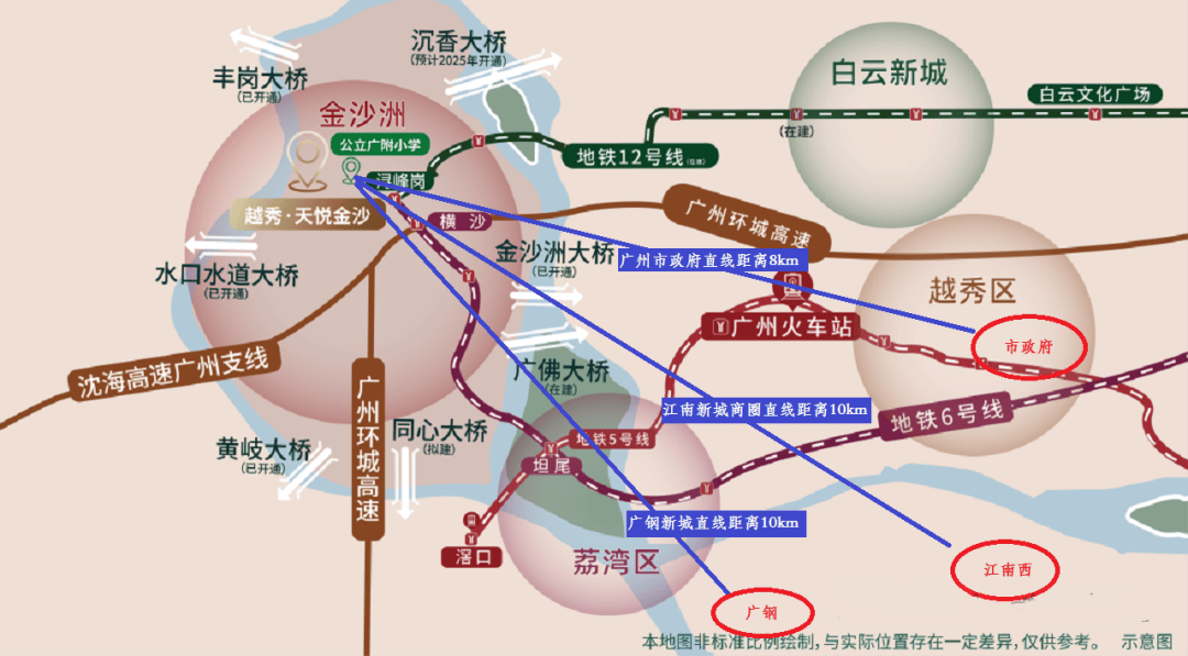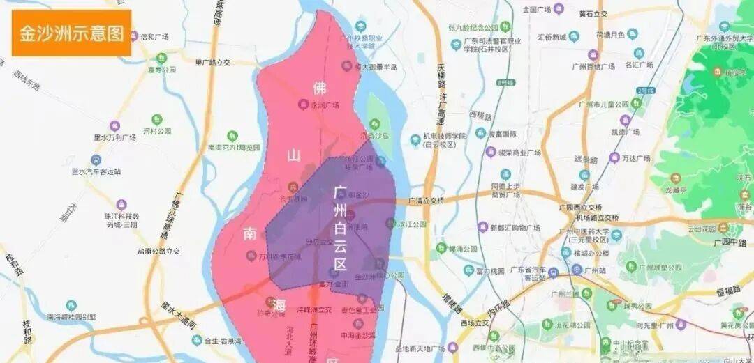 金沙洲的区位,其实都还行,横跨广州白云区和佛山南海区,临近荔湾,和广州的主城区相隔不远,尤其是广钢新城、白鹅潭、白云新城这些,对于不少人来看,这样的距离,是符合通勤距离的。