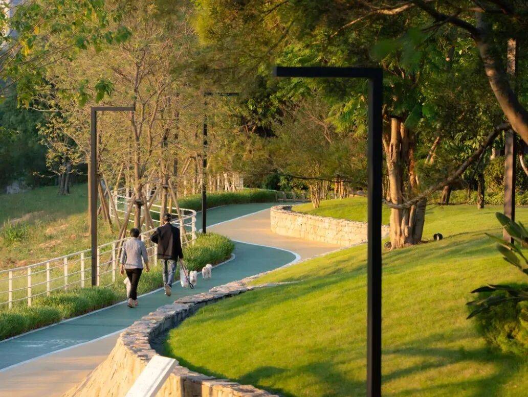 项目湖山资源及原生台地景观内外融合一体化贯通,打造山的活力回环水的形态系统,叠水游园墅居体验
