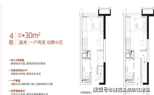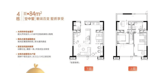 户型为一房一厅一卫设计,空间布局合理,动静分区,东南 / 东北向采光充足,无遮挡视野。下层规划客厅、餐厅、厨房、卫生间,上层规划卧室、储物空间,4.5 米层高打造宽敞居住体验,可改造为双钥匙户型,分层出租,收益翻倍,自住与投资皆宜。